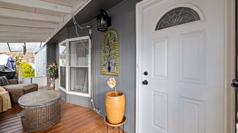 The large, private, covered all-season front deck highlights space for another living room! The entrance features a ramp for easy access to the front door. Right next to the deck is a spacious patio space-what a bonus for outdoor living!