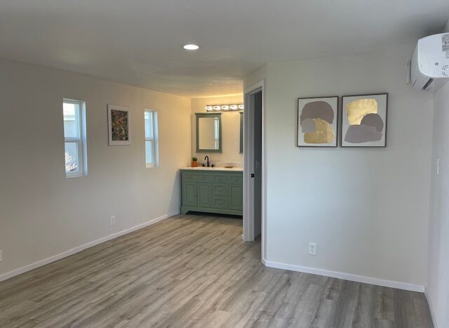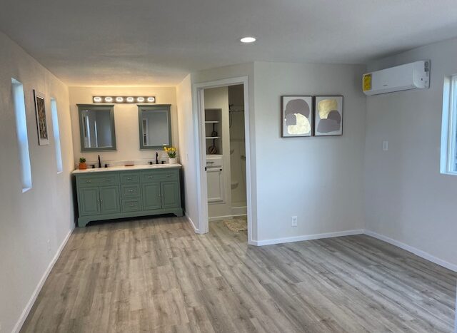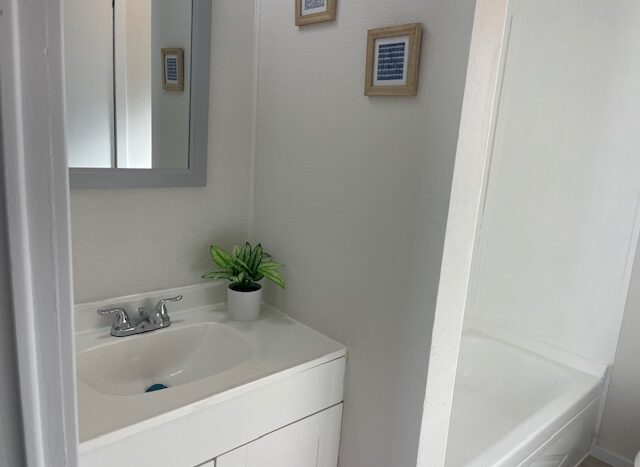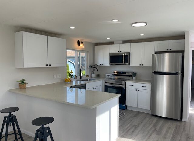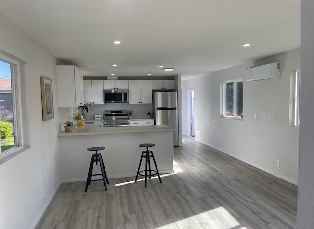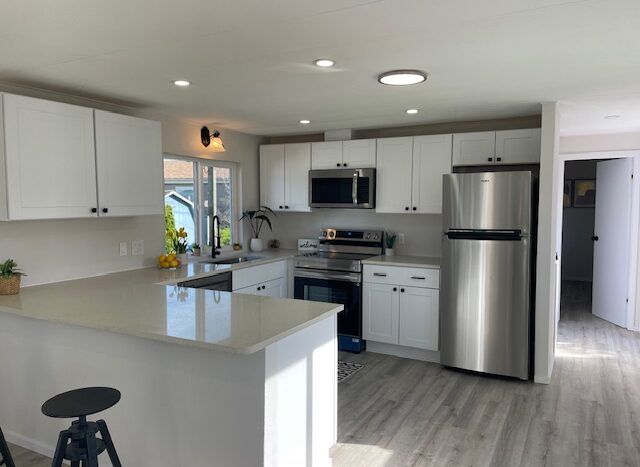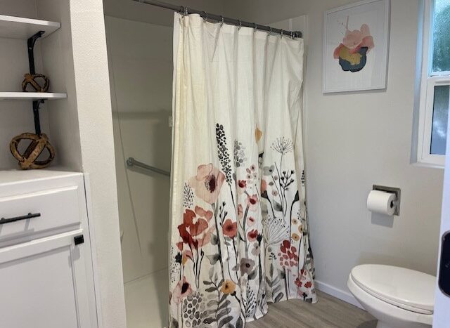 The primary suite offers ample space for a king-size bed, a walk-in shower, and an updated bathroom with a new vanity, toilet, and flooring. The guest bedroom is located on the opposite end of the home and comfortably fits a queen-size bed. The adjacent guest bath has been fully renovated with a new vanity, sink, hardware, and flooring.