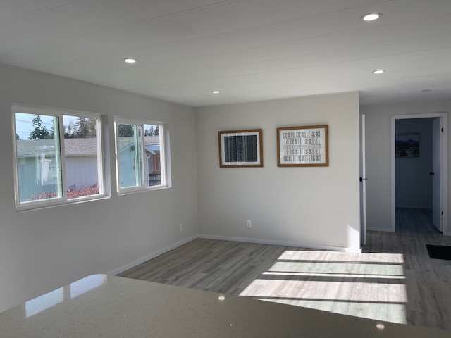 Step into the spacious family room filled with natural light from large windows and enhanced by new recessed lighting. The stunning kitchen features quartz countertops, a breakfast bar, white shaker-style cabinets, stainless steel sink with sprayer, and stainless steel appliances—all included in the sale.